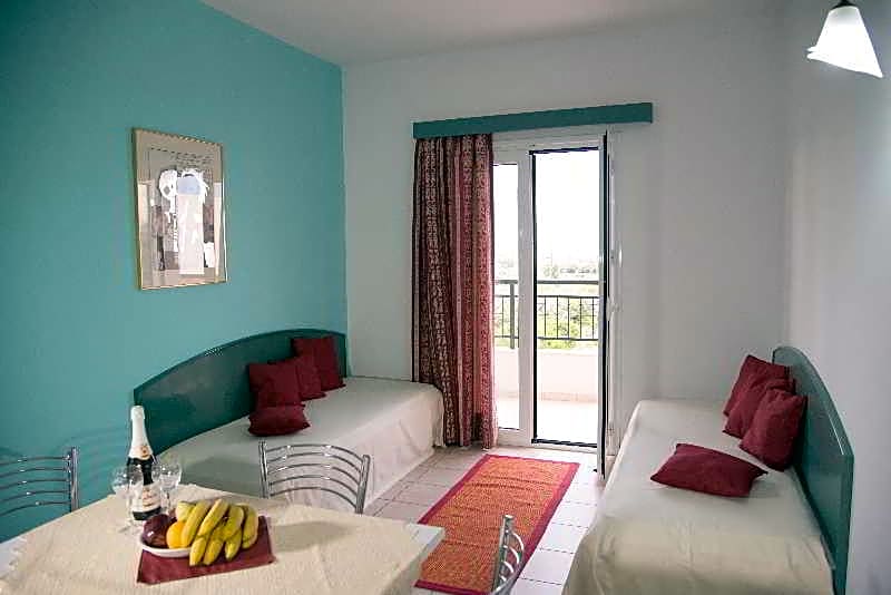 Spacious, air-conditioned apartment with a balcony overlooking the sea. Includes kitchenette with cooking facilities and dining area.